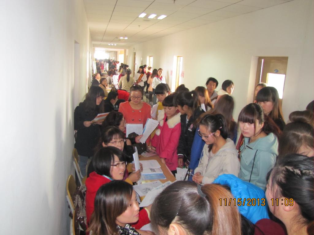 11月15日,师范教育系举行2014届毕业生专场招聘会,省内外近百家用人单位前来我系招聘。招聘会规格高、规模大,有庆安公司幼儿园、品格奥林匹克花园幼儿园、西安交大幼儿园、小天鹅教育集团、吉的堡教育集团等一批省内高端示范园来我系挑选优秀毕业生,渭城区教育局副局长也特率领辖区内21所幼儿园来我系招聘。参加此次招聘会的毕业生共400余人,有意向签约学生近300人。