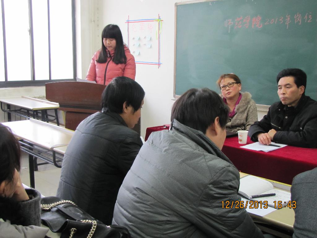 12月26日下午,师范学院在教学楼1028召开2013年岗位目标责任考核测评会,师范学院全体教职工参加会议,会议由副院长来小玲主持。师范学院党总支书记尚英武首先对考核测评会的重要性做了宣讲,并对考核评分标准做了详细的说明。师范学院张芳等十位同志随后依次对自己一年来的工作进行全面述职。全体教职工秉持客观公正的态度对述职的十位同志进行现场打分。测评会成立领导小组,设有专门的监票员,整个测评过程公正、透明,测评结果真实、有效。最终测评结果将经师范学院党政联席会议讨论决定。