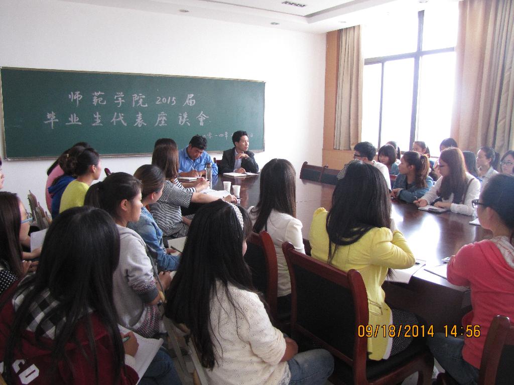 9月18日下午,师范学院在教学楼1031会议室召开2015届毕业生座谈会。师范学院党总支书记尚英武、学工办主任李生晔以及2015届毕业生代表参加了此次会议。会议上,毕业生代表踊跃发言,尚书记、李主任就学生疑问逐一、耐心解答。会议最后,尚书记做了总结讲话,主要分析了2015年就业环境,同时鼓励毕业生们,提高人际交往能力,强化自身专业技能,准确定位,要对未来充满信心。