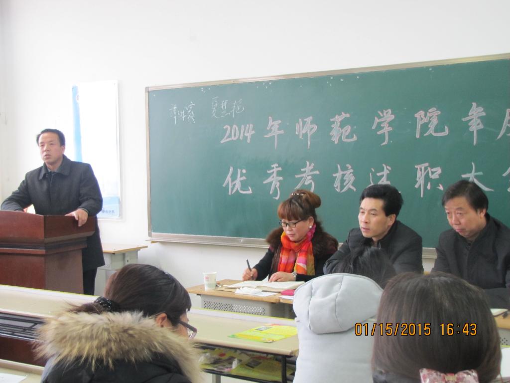1月15日下午,师范学院在教学楼1028召开2014年岗位目标责任考核测评会,师范学院全体教职工参加会议,会议由党总支书记来尚英武主持。会议首先对我院金凤、吕松哲同志荣获咸阳职业技术学院2014年“十佳辅导员”荣誉称号以及金凤、来言芳同志在“咸阳职业技术学院辅导员职业技能大赛”中分别荣获一等奖、三等奖表示热烈的祝贺。其次,院长陈刚对考核测评会的重要性做了宣讲,并对考核评分标准做了详细的说明。师范学院谭琳霞等十二位同志随后依次对自己一年来的工作进行全面述职。全体教职工秉持客观公正的态度对述职的十二位同志进行现场打分。测评会成立领导小组,设有专门的监票员,整个测评过程公正、透明,测评结果真实、有效。最终测评结果将经师范学院党政联席会议讨论决定。
