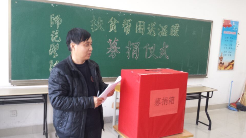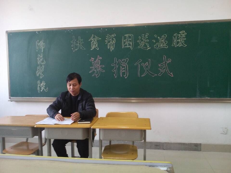 2015年12月2日,师范学院组织开展了“扶贫帮困送温暖”的捐赠活动。为了保障贫困群众安全温暖过冬,学院号召在全院范围内开展向冬令困难群众“扶贫帮困送温暖”募捐活动。师范学院副院长王宁堂主持本次募捐活动,师范学院全体教师参加。老师们积极的响应学院的号召,踊跃参与,慷慨解囊,希望为贫困群众送去一份温暖,弘扬了“一方有难,八方支援”的传统美德和为困难群众排忧解难的决心,为我院学子树立了榜样。活动中我院党员干部带头捐款,发挥了模范作用。