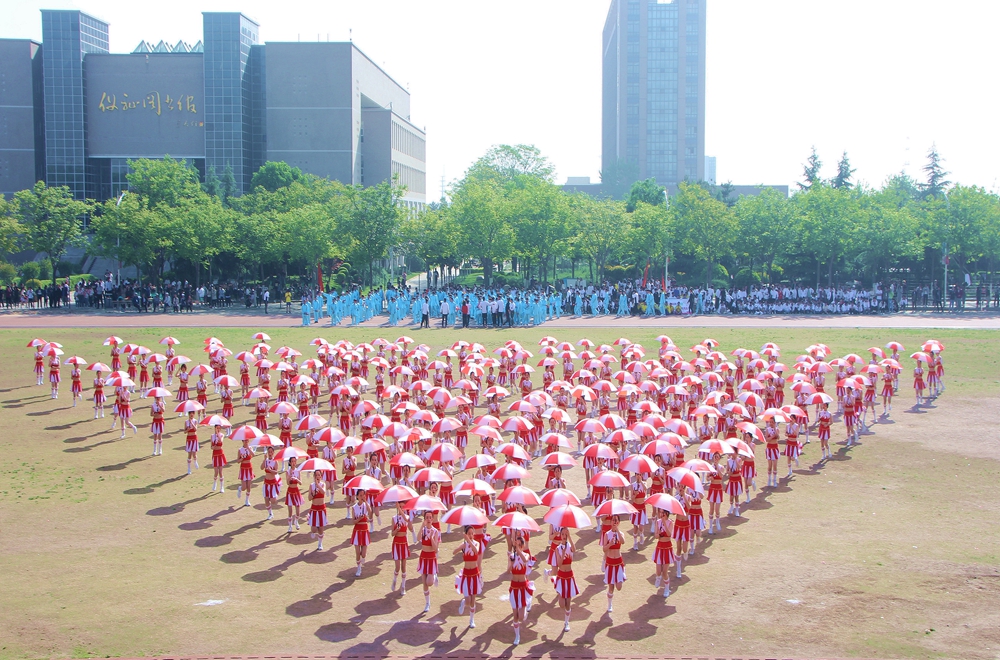 师范学院啦啦操整体艺术设计围绕“建国70周年”展开,以《我和我的祖国》为主题,创意新颖、表演形式丰富、流动感十足。表演伊始,学生们身着红白相间、朝气十足的服装,伴随着中国现代民乐欢快的节奏律动,旋转着炫丽的运动伞,变换着不同的阵型,远近结合、层次鲜明,阵型中 “中国”二字,紧扣主题。随后是一段由钢琴演奏的《我和我的祖国》主旋律片段并伴随着独舞,仿佛带大家走进了一副恬静优美的中国画中。最后,在《我和我的祖国》铿锵有力、气势磅礴的旋律中,师范学院的数名学生齐捧鲜艳的五星红旗和身着红色大摆裙的啦啦操演员,从主席台下奔跑至会场的中央,顿时全场欢呼声、尖叫声不断,将啦啦操表演推向高潮,展现了师范学院全体师生对祖国的无限热爱之情。