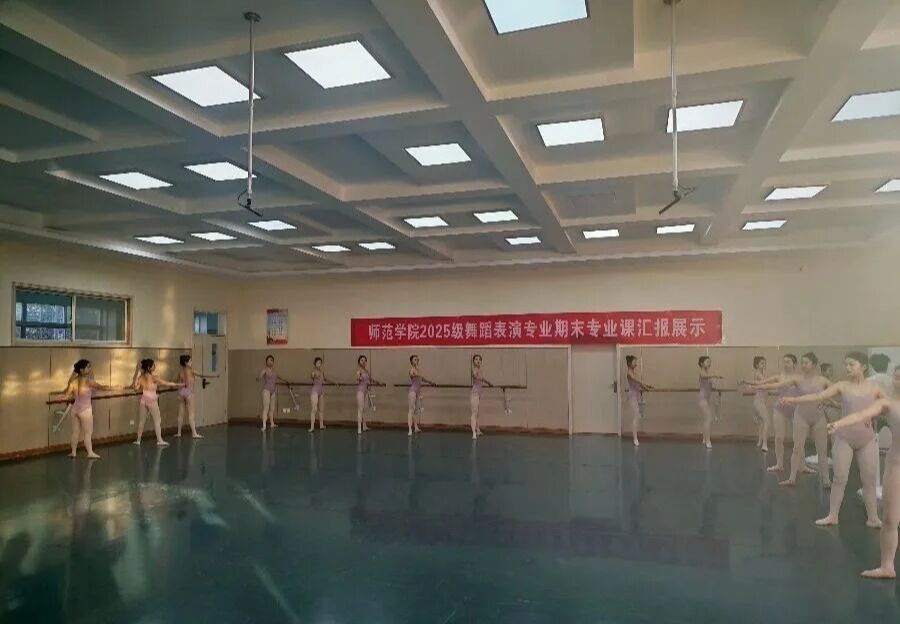 2026年1月12日上午,师范学院舞蹈表演专业2025级新生首次期末专业课汇报在教学楼③202教室举行。来自舞蹈表演专业1班、2班的54名新生集中展示了《芭蕾基训》《舞蹈基本功》两门课程的学习成果。师范学院管理干部、各教研室主任、音乐教研室与舞蹈教研室全体教师到场观摩指导。